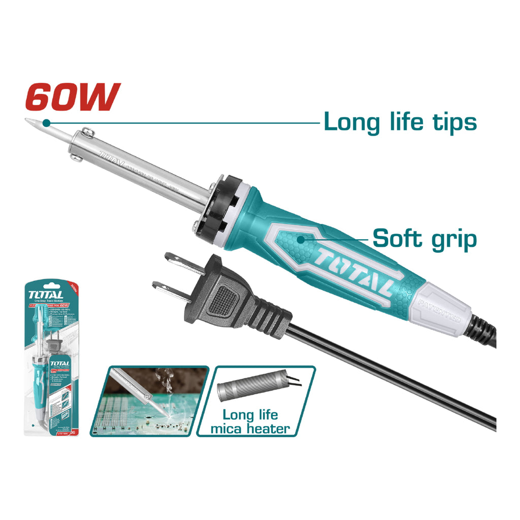 Soldador cautín de estaño eléctrico. 60 W. Precalentado de 3 a 5 min. Voltaje: 110-120 / 60 Hz. Con una pieza de Soporte. Punta reemplazable de larga vida.
