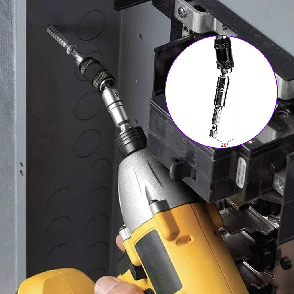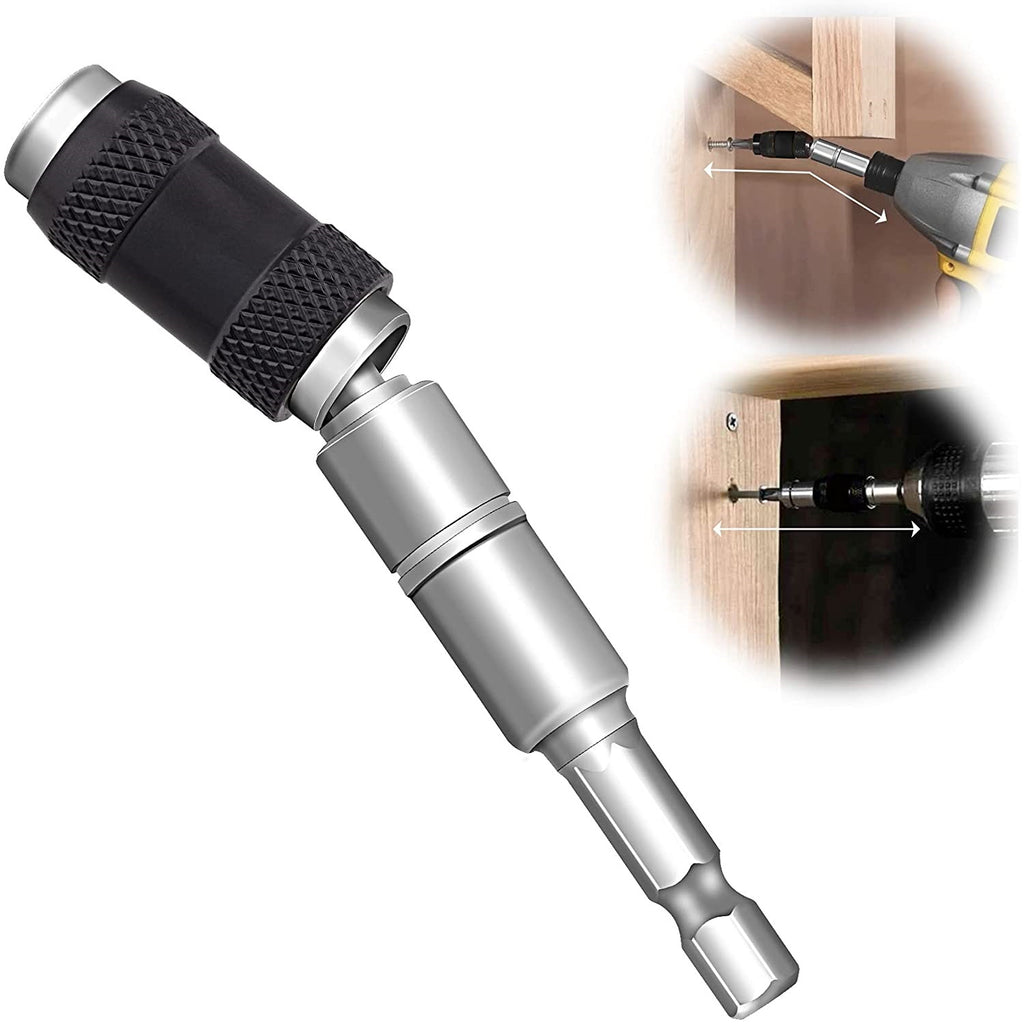 Este soporte de brocas pivotante de ángulo giratorios y rectos. Puedes deslizar el collar de metal hacia adelante y doblarlo en un ángulo giratorio de 20° para acercarse a esos lugares difíciles de alcanzar como esquinas o lugares estrechos, o tirar del collar de metal hacia atrás para bloquear el soporte en el ángulo recto como un extensor de portabrocas.