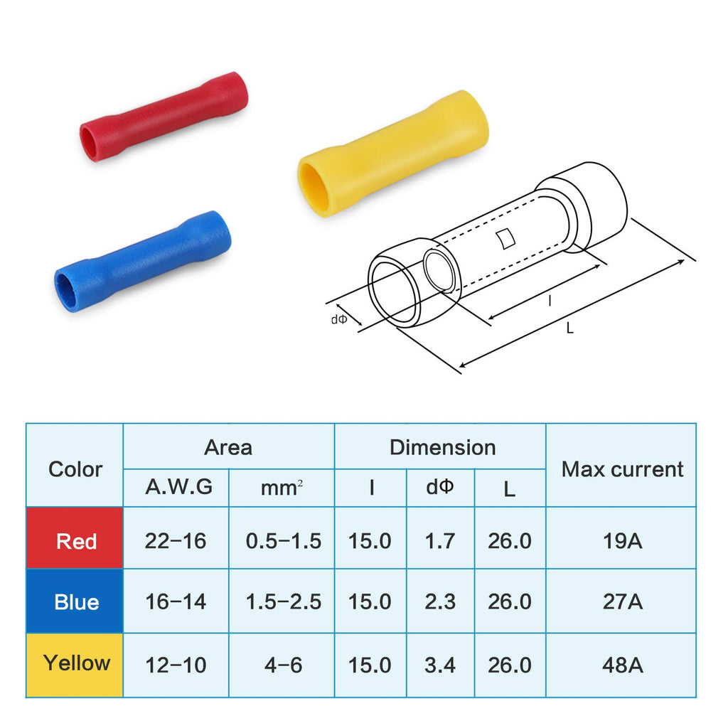 -Colores: Rojo, azul y amarillo, indican diferentes tamaños de calibre de los conectores eléctricos para una fácil identificación cuando se utilicen.