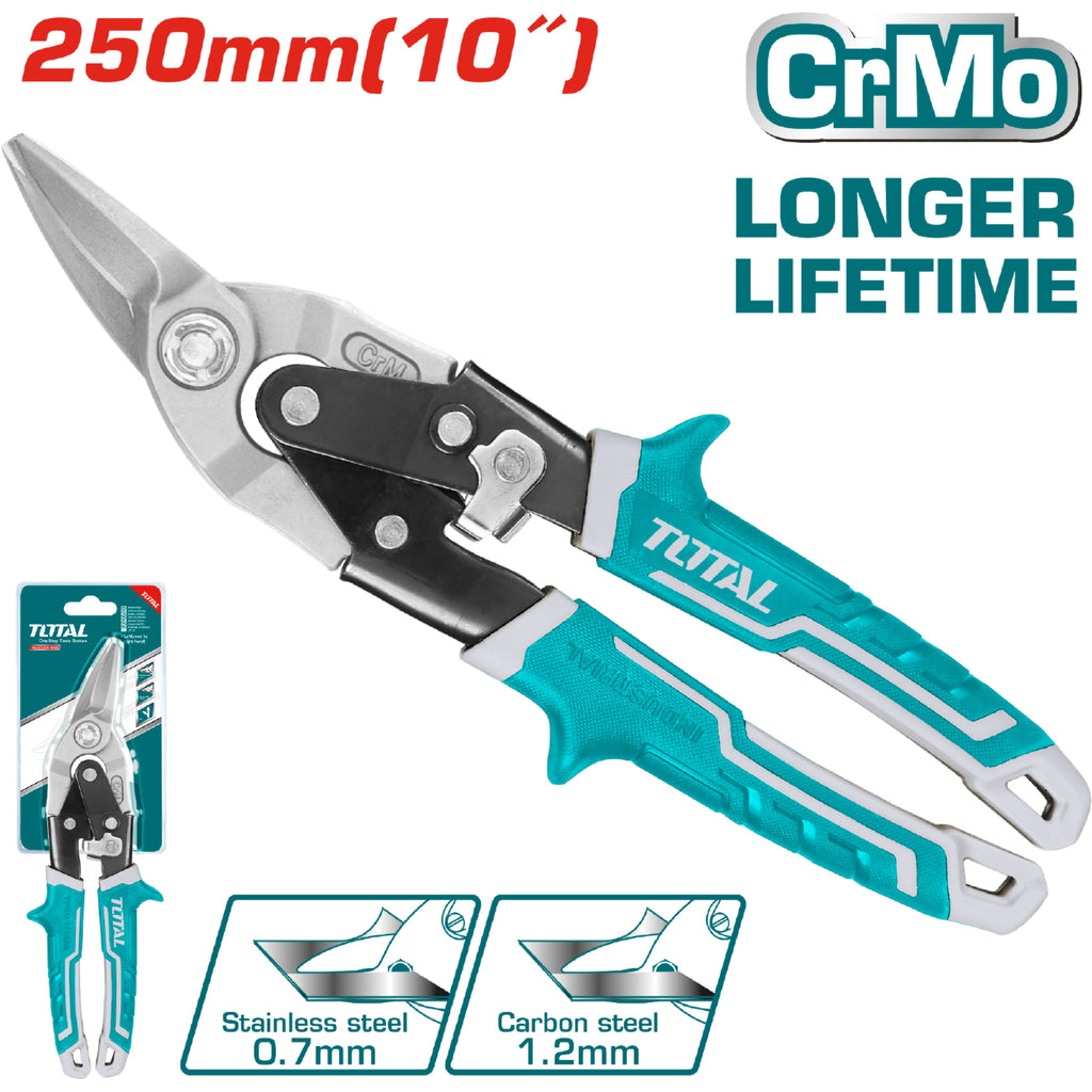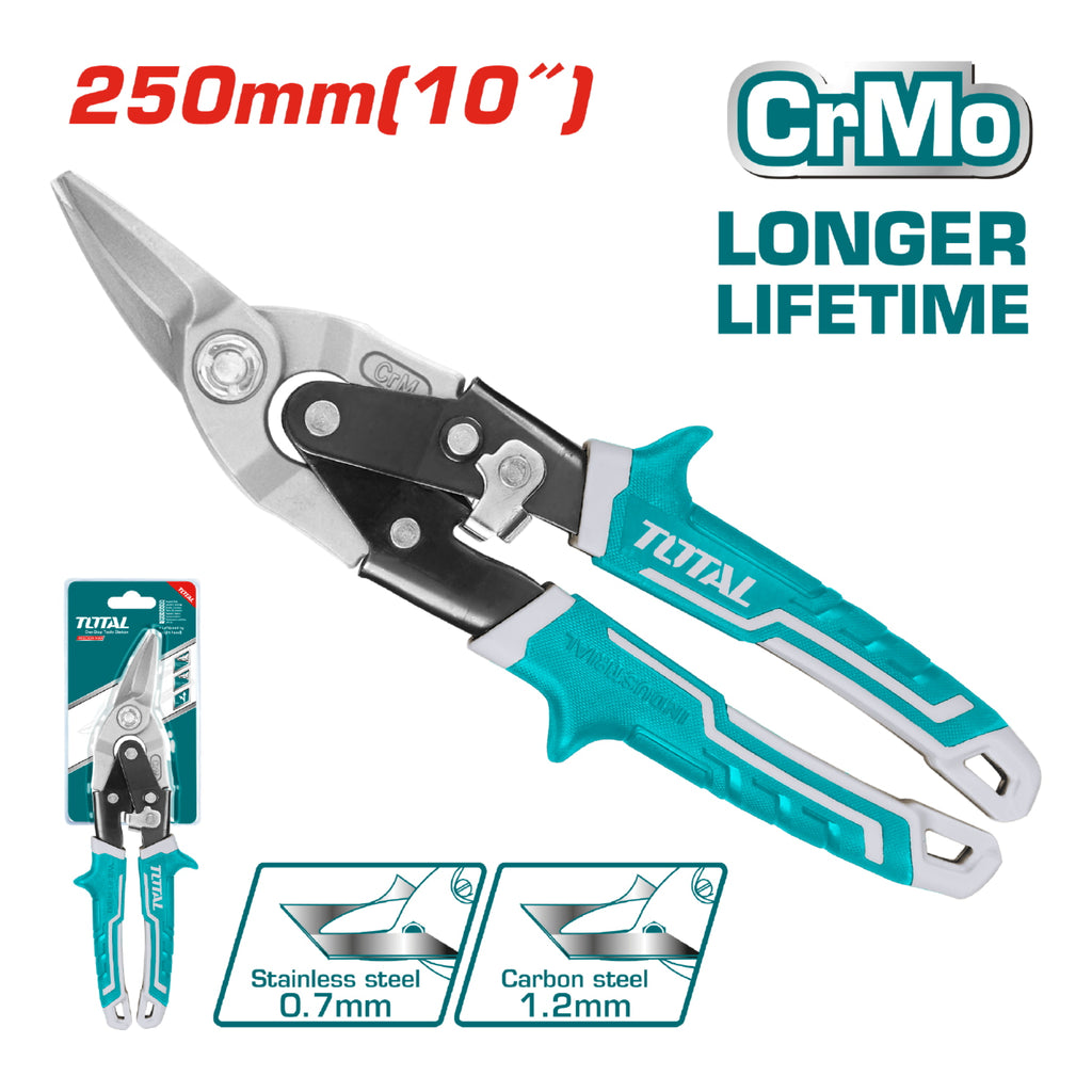Tijera de Aviacion de 250 mm (10'') Izquierda. CrMo. Espesor máx. De corte: Acero al carbono ≤ 1.2 mm. Acero inoxidable ≤ 0.7 mm.