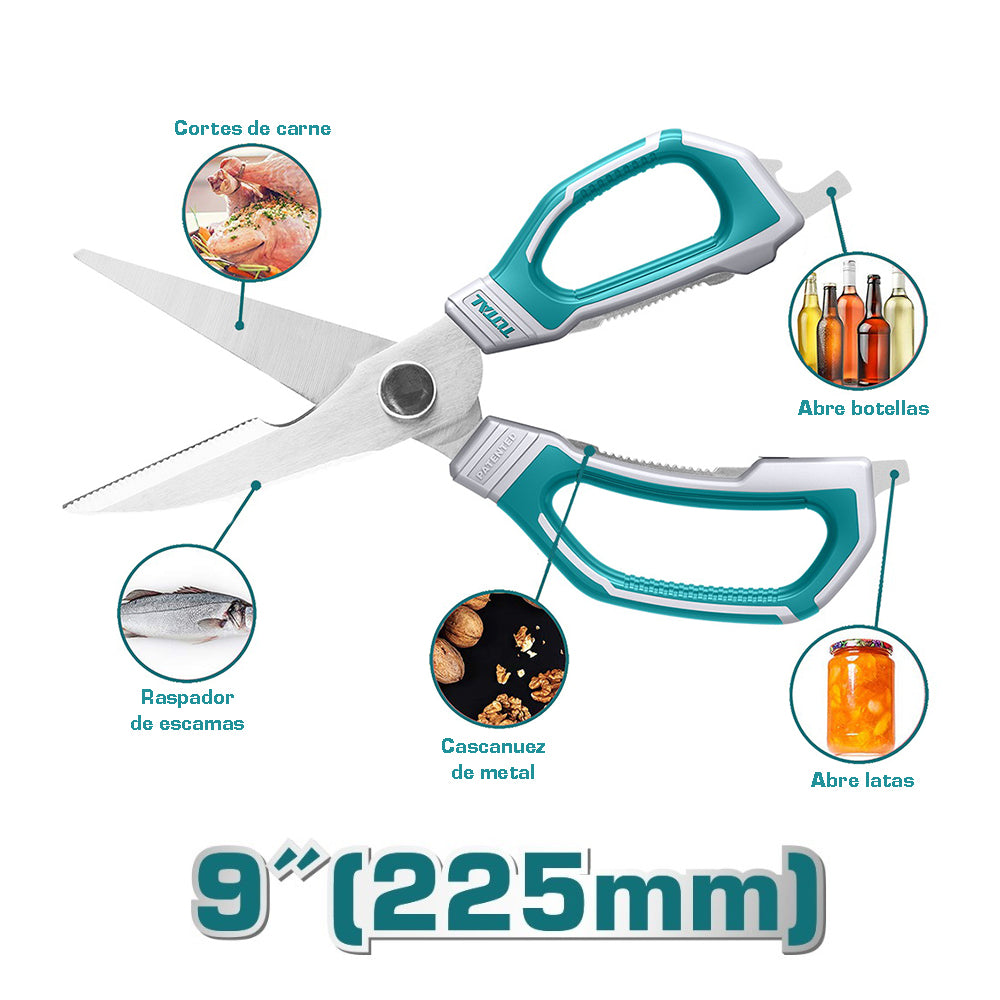 Tijera de Cocina 225 mm (9'') de Acero Inoxidable. Ancho de la Hojilla: 3.0mm. Escala de corte, raspador, raja nuez, y abridor de botellas y función de abre lata. Diseño de Mango ergonómico de superficie arenada.