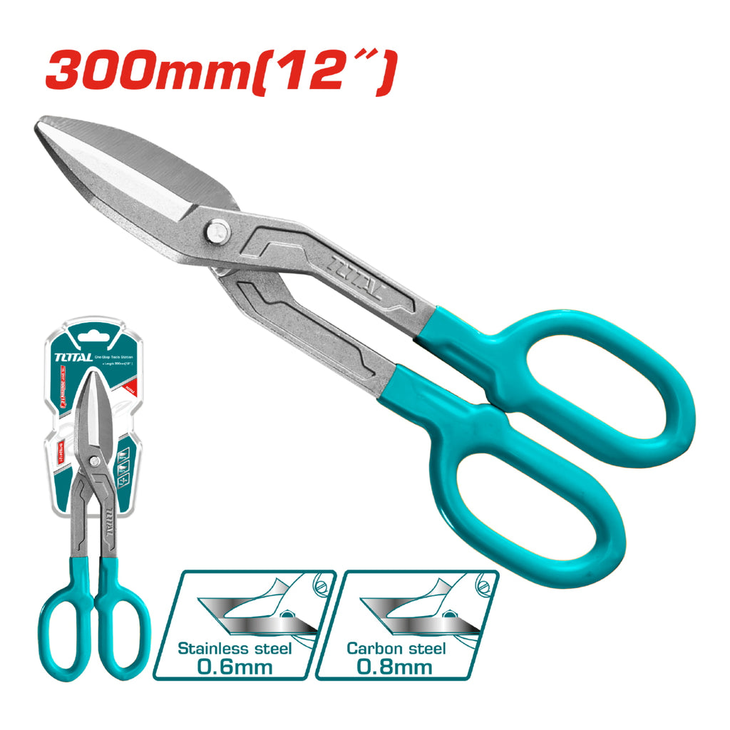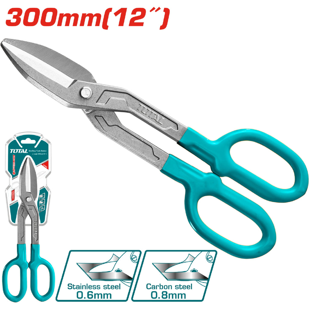Tijera de hojalatería de 12''''. Acero forjado con mango de doble agarre. Capacidad de corte Acero de carbón: ≤0.8mm/ Acero inoxidable: ≤0.6mm. Blíster.