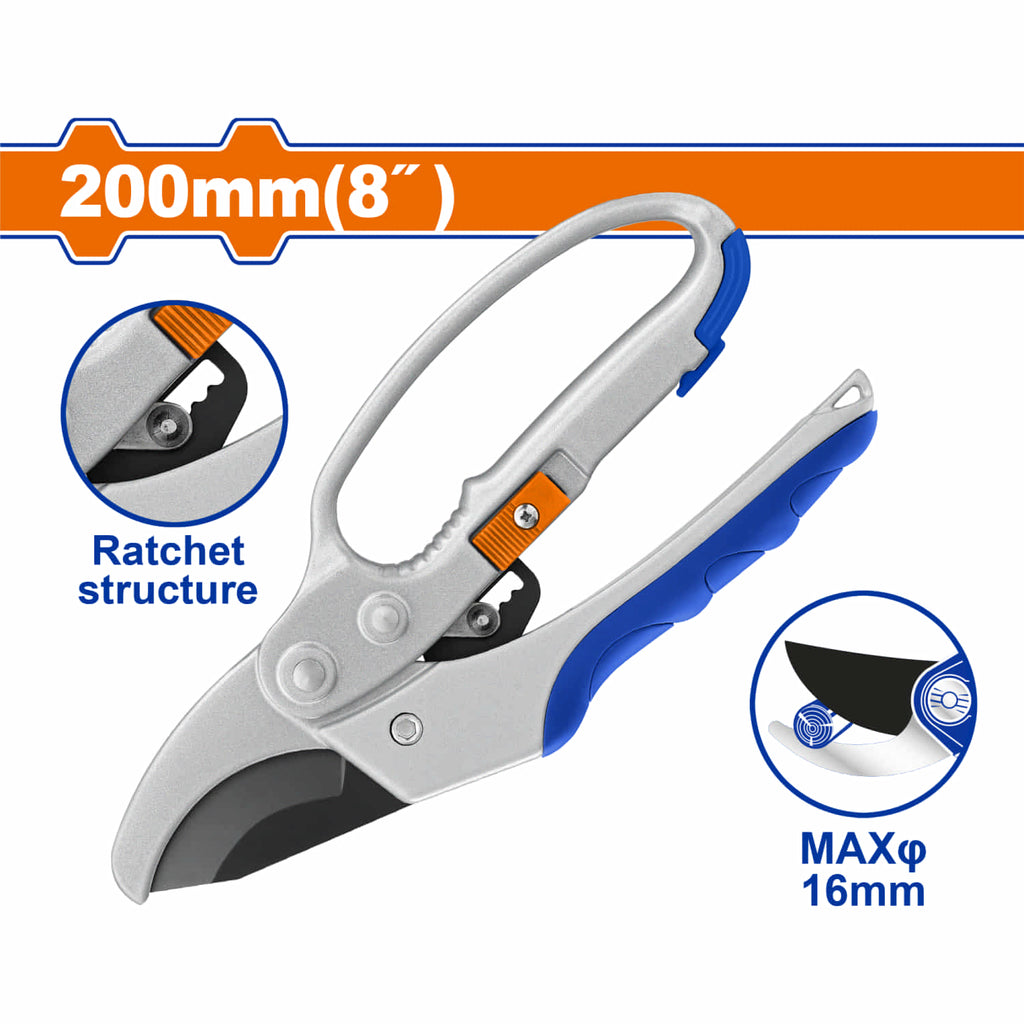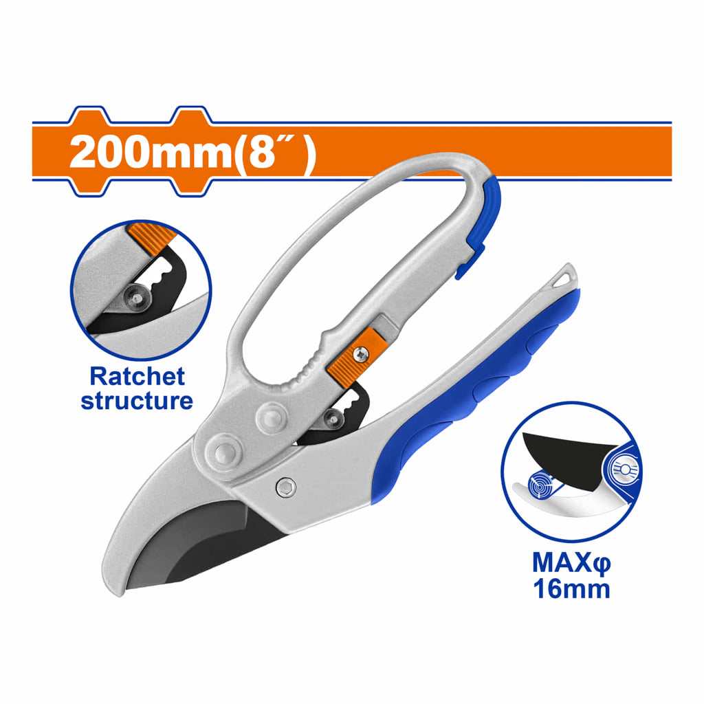 | Características | Tijera para podar 8" capacidad de corte 16mm Jardinería. Con mangos robustos de aluminio. Diámetro máximo de corte: 16mm. Recubrimiento de teflón por tratamiento térmico. |