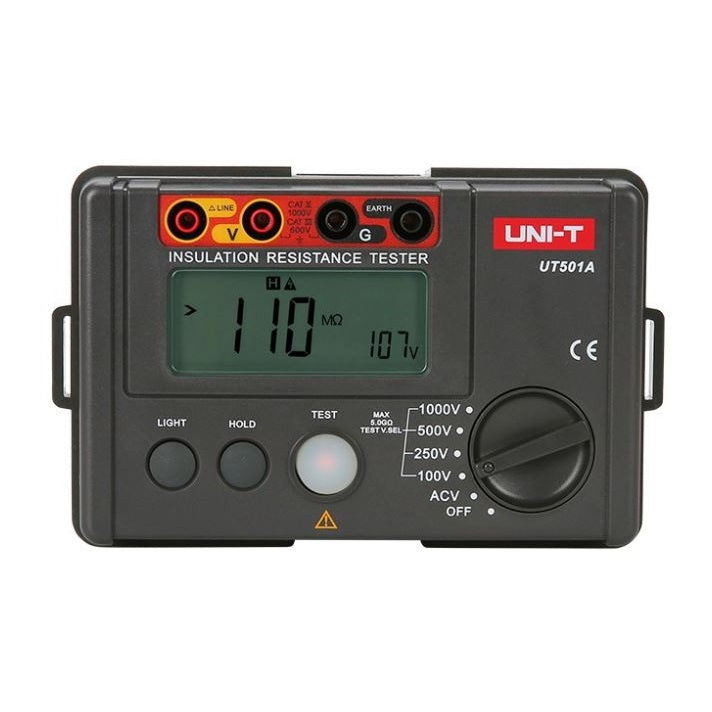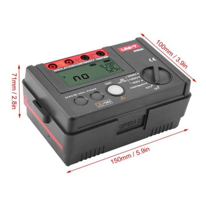 UNI-T Megóhmetro Digital (Medidor de Aislamiento) medidor de resistencia de aislamiento y voltage AC. Voltaje: 100v/250v/500v/1000v - 5.5 G ohm. Utiliza 6 Pilas de 1.5 V - LR14 (No incluidas). Dimensiones: 150 × 100 × 71 mm.