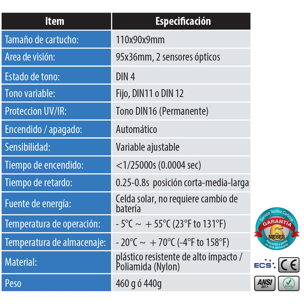 | Certificaciones | ECS; CE; ANSI Z87.1, RoHS |